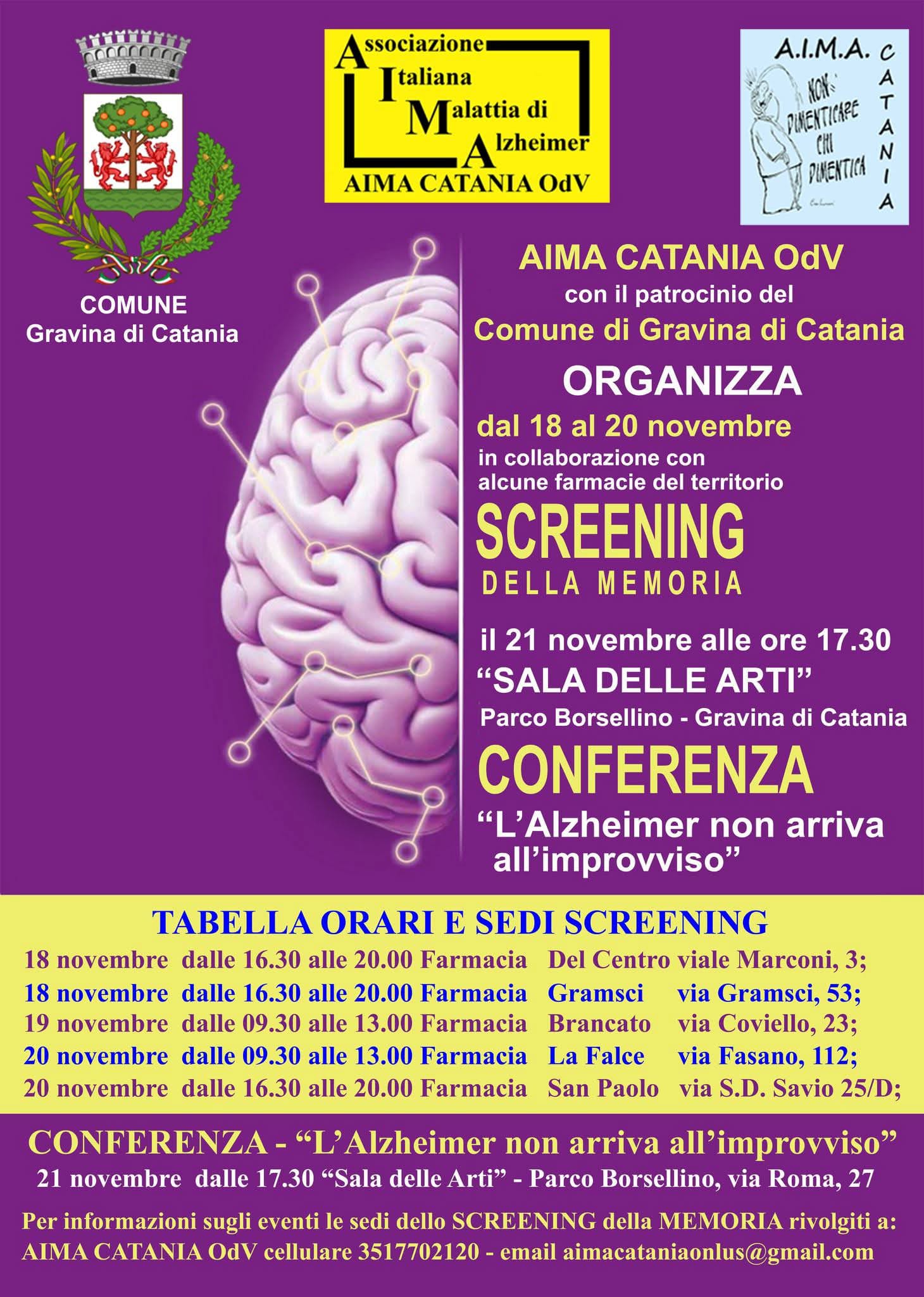 Il Sindaco Massimiliano Giammusso ed il vicesindaco con delega ai Servizi sociali ed al Distretto socio-sanitario 19 Claudio Nicolosi comunicano alla Cittadinanza che da martedì 18 a giovedì 20 novembre si svolgerà lo screening della memoria presso diverse farmacie del territorio secondo gli orari di seguito indicati: