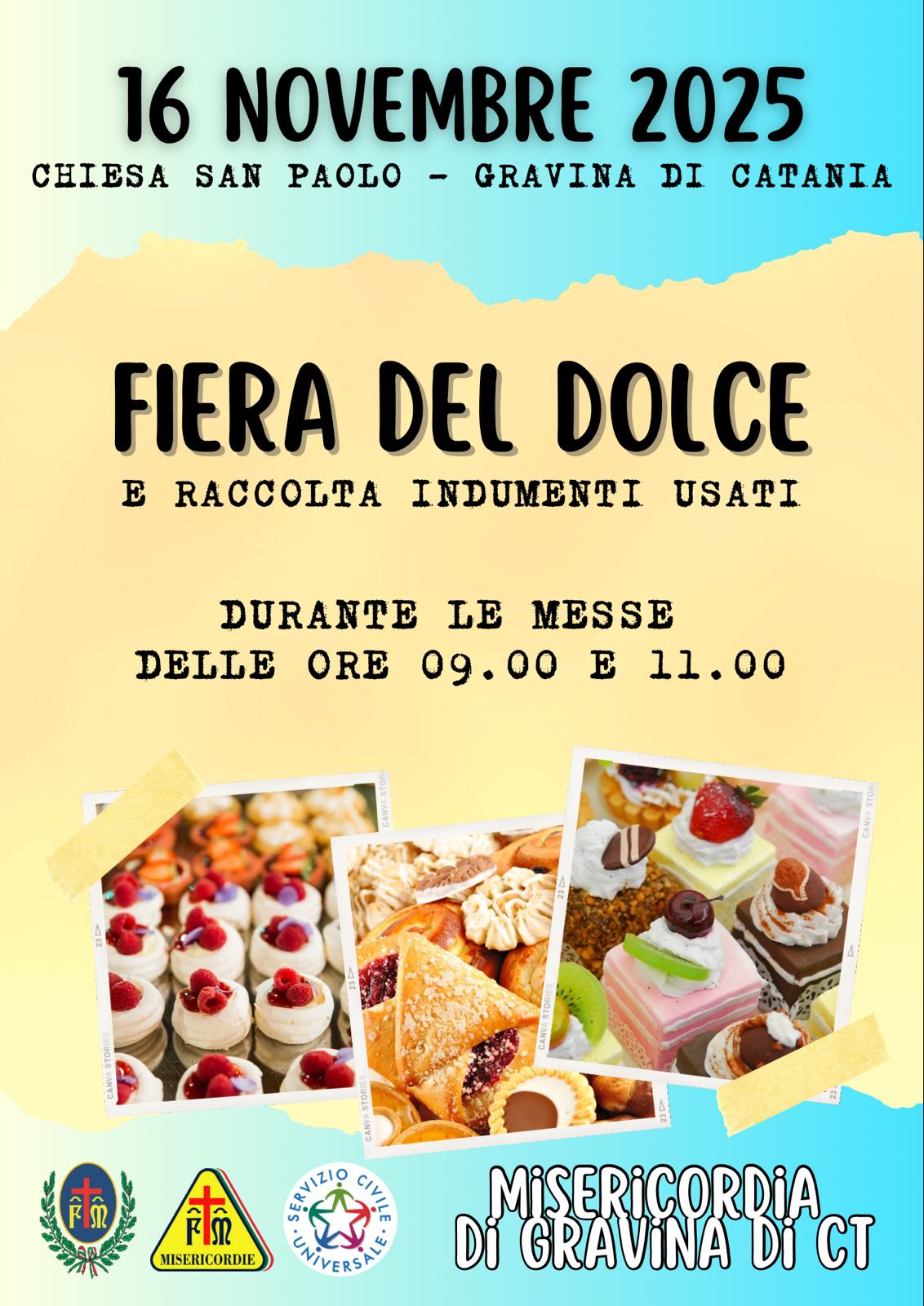 Il Sindaco Massimiliano Giammusso, a nome di tutta l'Amministrazione comunale, comunica alla Cittadinanza che domenica 16 novembre, durante le due messe delle ore 9:00 ed 11:00, in Piazza Madonna di Pompei a San Paolo avrà luogo la fiera del dolce e la raccolta di indumenti usati dietro iniziativa della locale "Misericordia".