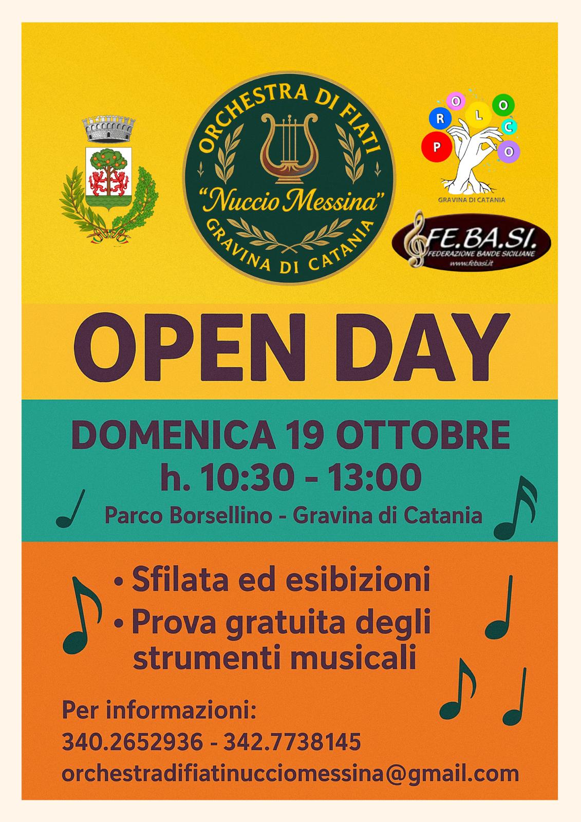 Il Sindaco Massimiliano Giammusso, il vicesindaco con delega alla Cultura e all'Istruzione Claudio Nicolosi e l'assessore allo Spettacolo Filippo Riela comunicano alla Cittadinanza che domenica 19 ottobre dalle ore 10:30 alle ore 13:00 presso l'area giochi del Parco comunale "Paolo Borsellino" di via Roma 27 (ingresso anche da via Costarelli e via Francesco Crispi) avrà luogo l'open day dell'Orchestra di fiati gravinese "Nuccio Messina".