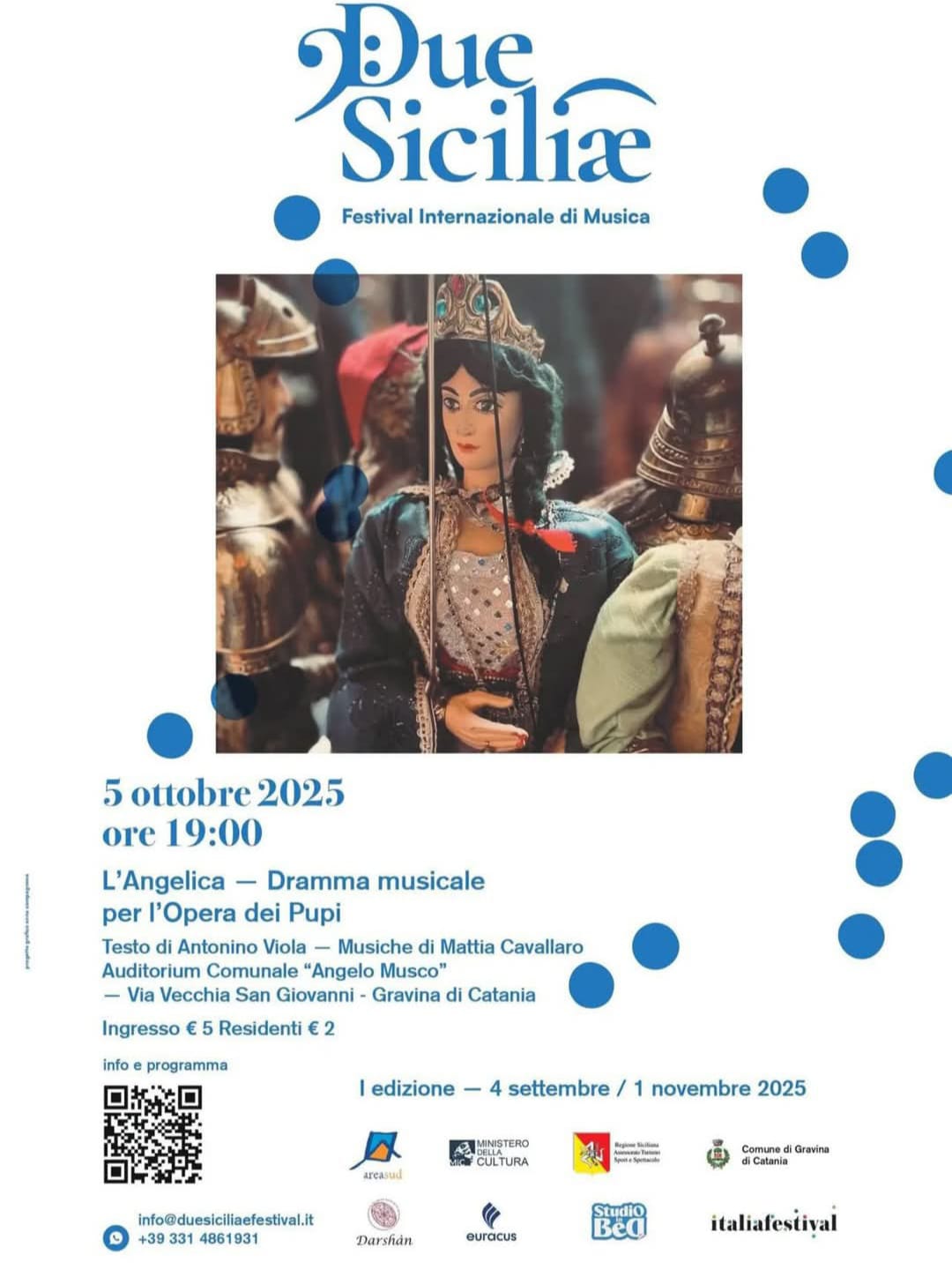 Domenica 5 ottobre, infine, presso l’Auditorium "Angelo Musco" di Via Unione europea alle ore 19.00 il fascino senza tempo dell’Opera dei Pupi incontrerà la grande letteratura cavalleresca con la prima nazionale dello spettacolo “L’Angelica tra Boiardo, Ariosto e Brusantini” della Compagnia teatrale Thalià. I celebri versi di tre autori, che hanno consegnato al mito i paladini di Francia e le loro avventure, verranno restituiti al pubblico attraverso il linguaggio scenico dei pupi siciliani, con testi di Antonino Viola, accompagnati dalle musiche dal vivo composte da Mattia Cavallaro. Sul palco si alterneranno combattimenti, amori e incanti, in un intreccio di poesia e teatralità che restituisce tutta la forza epica e popolare di questa tradizione.