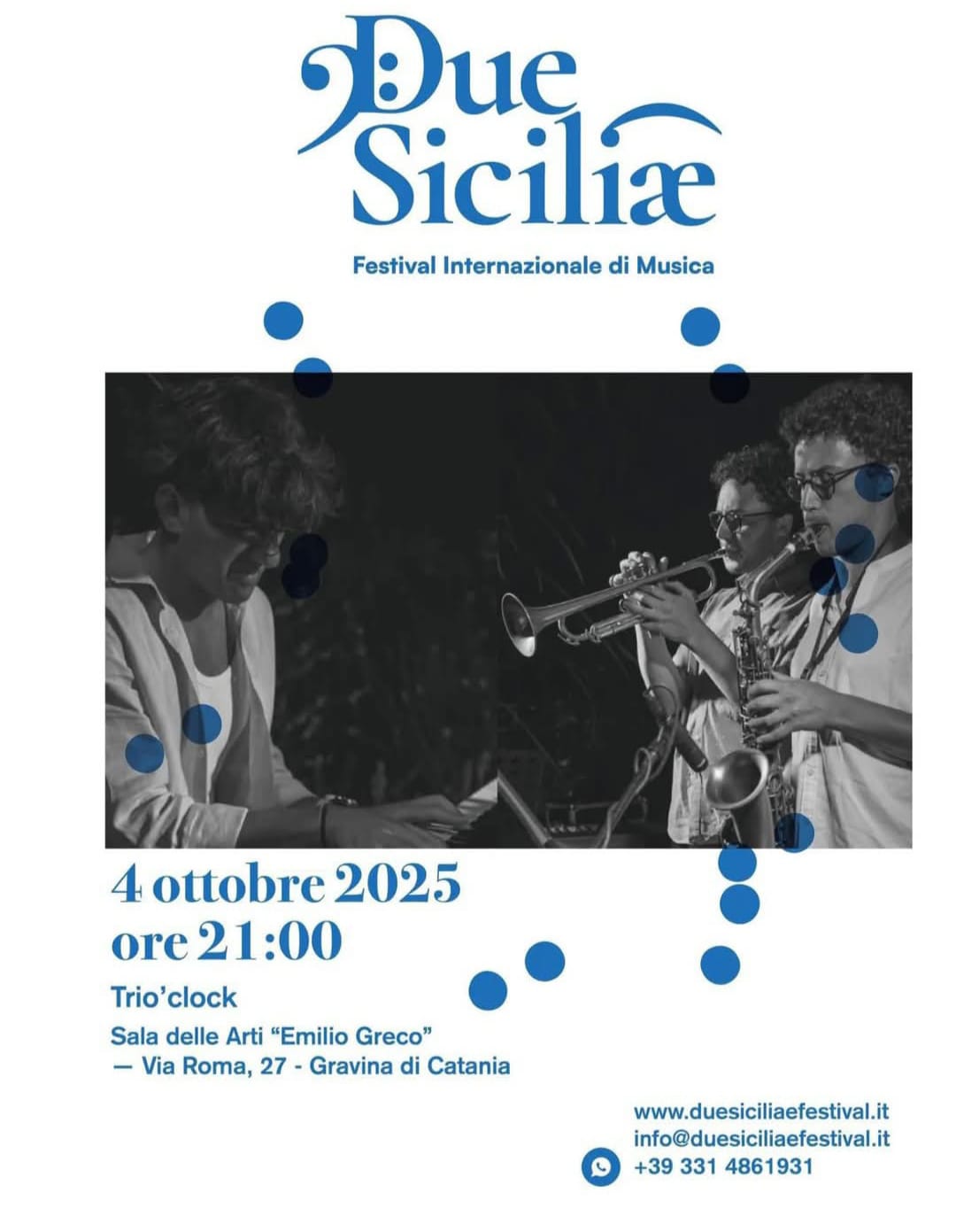 Sabato 4 ottobre, sempre alle ore 21.00 alla Sala delle Arti ", Emilio Greco" sarà la volta del Trio ’clock composto da Gabriele Santangelo (pianoforte), Marco Bella (sassofono) e Francesco Bella (tromba) che proporranno un viaggio nel cuore del jazz moderno: un intreccio di melodie che oscillano tra intimità e slancio, tra sussurri lirici e ritmi pulsanti, tra echi classici ed improvvisazione.