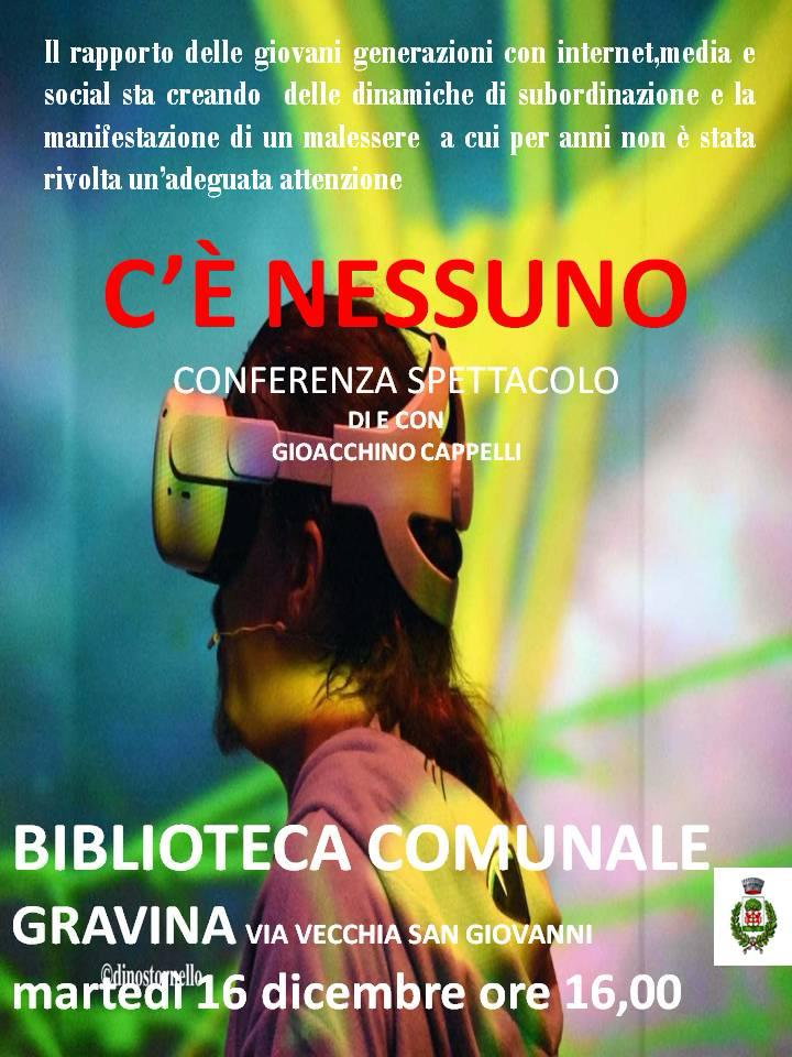 Il Sindaco Massimiliano Giammusso, il vicesindaco con delega alla Cultura ed all'Istruzione Claudio Nicolosi e l'assessore allo Spettacolo Filippo Riela comunicano alla Cittadinanza, a nome di tutta l'Amministrazione comunale, che martedì 16 dicembre alle ore 16,00 presso la biblioteca comunale "Francesco Virzì" sita in via Unione europea (stessa sede del Centro civico) si svolgerà la conferenza spettacolo di Gioacchino Cappelli dal titolo "C'è nessuno" dedicata ai rischi dei social specie per i più giovani.