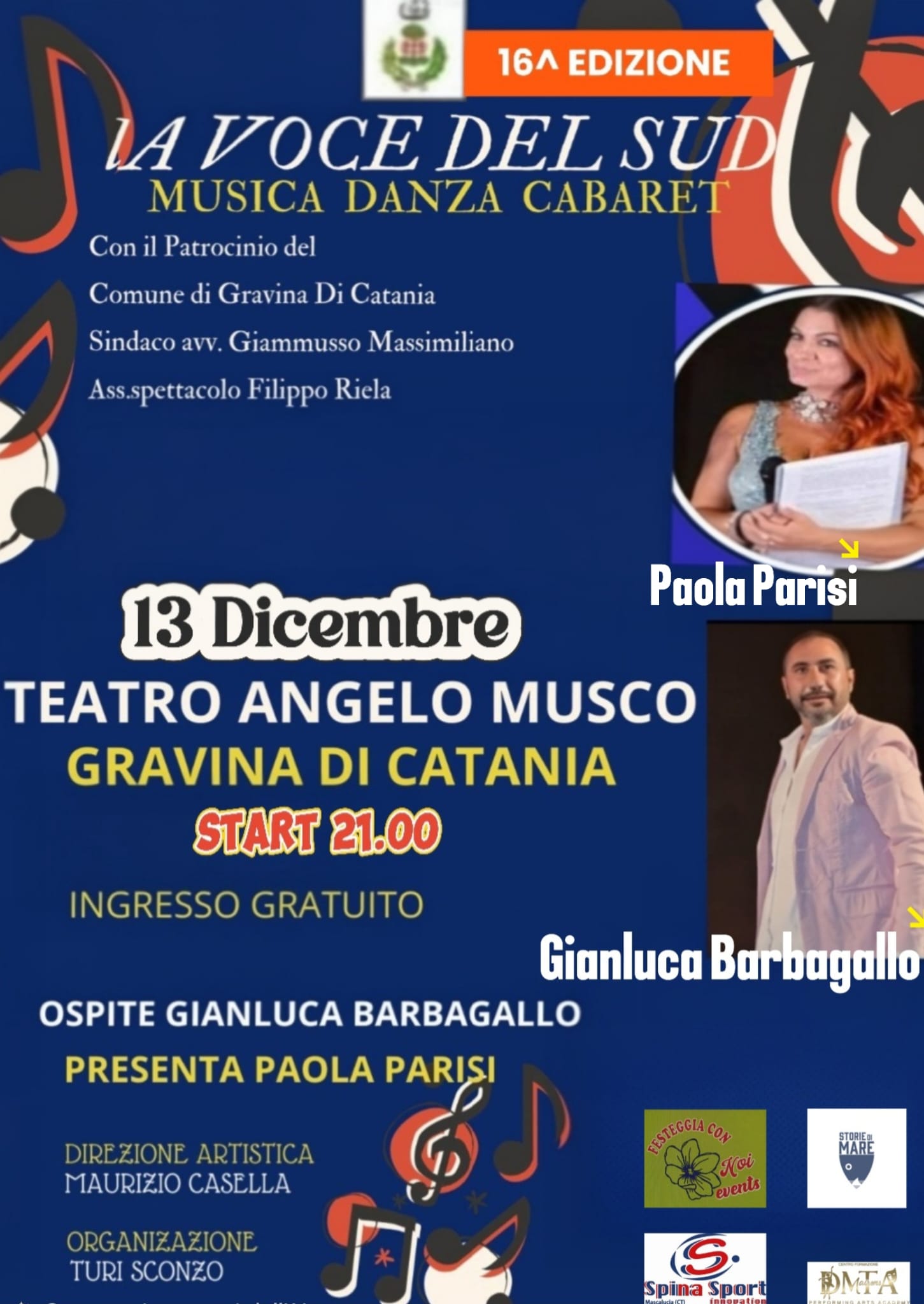 Il Sindaco Massimiliano Giammusso e l'assessore allo Spettacolo Filippo Riela comunicano alla Cittadinanza, a nome di tutta l'Amministrazione comunale, che sabato 13 dicembre alle ore 21:00 presso l'auditorium "Angelo Musco" di Via Unione europea (stessa sede del Centro civico) avrà luogo la sedicesima edizione dell'evento "La voce del Sud": musica, danza e cabaret con la partecipazione di Gianluca Barbagallo.