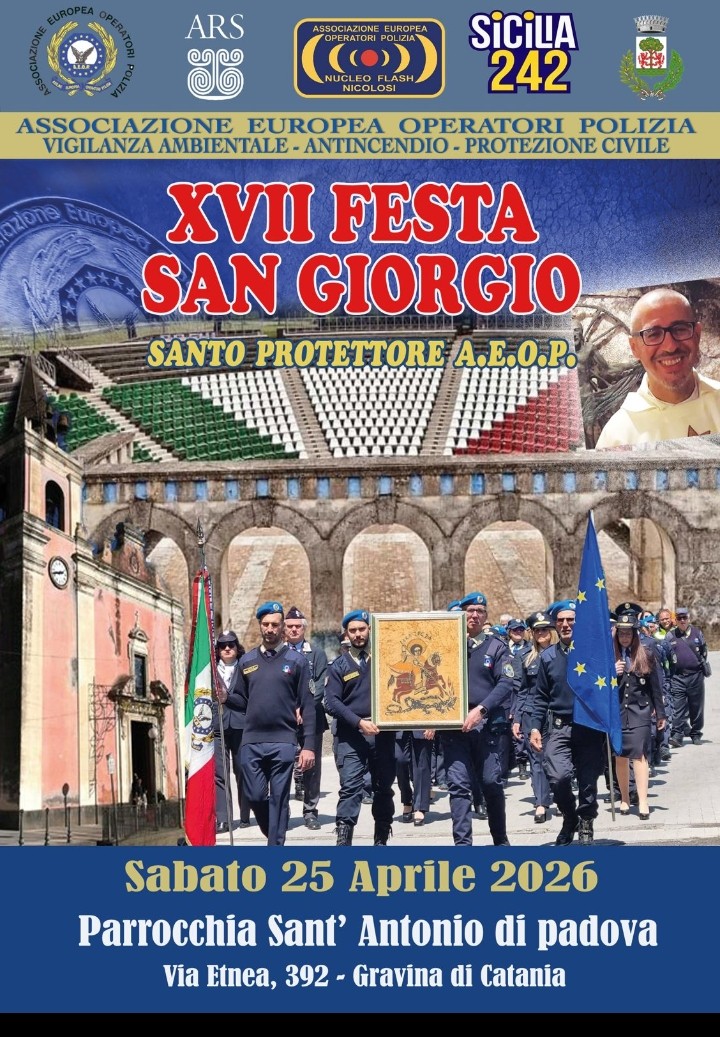 Il Sindaco Massimiliano Giammusso e l'assessore allo Spettacolo Filippo Riela comunicano alla Cittadinanza, a nome di tutta l'Amministrazione comunale gravinese, che sabato 25 aprile alle ore 12:00 presso la Chiesa Madre S. Antonio di Padova e subito dopo presso il teatro all'aperto "Turi Ferro" sito all'interno del parco comunale "Paolo Borsellino" di via Roma 27 (ingresso anche da via Costarelli e via Francesco Crispi) avrà luogo la XVIII edizione della festa di San Giorgio, protettore dell'Associazione Europea Operatori di Polizia (AEOP).
