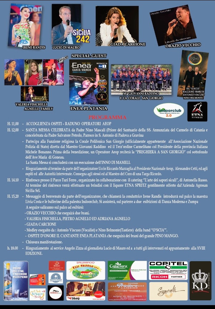 Come da locandina, l'evento - che è stato promosso dall'AEOP, dall'Associazione "Sicilia 242" e realizzato grazie all'ARS e al patrocinio del Comune di Gravina di Catania - si articolerà lungo tutta la giornata, dalle ore 11:00 alle ore 18:00, e prevede la celebrazione della Messa alle ore 12:00 cui farà seguito, presso il parco "Borsellino", l'intervento di diversi volti noti del panorama artistico e culturale siciliano: da Irene Randis a Lucio Di Mauro, da Giada Carcione a Orazio Vecchio e ancora Valeria Fisichelli, la Agnello Family, Enea Platania, il M° Giovanni Raddino e la Corale San Giorgio, Antonio Viscuso (vocalist) e Nino Belmonte (tastiere) by " 'O scià" che proporranno un tributo a Claudio Baglioni.