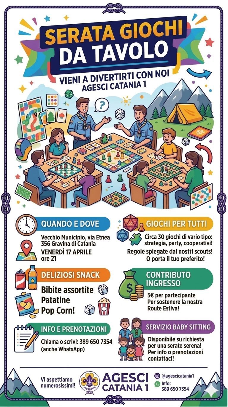 Si comunica che venerdì 17 aprile alle ore 21:00 presso i locali del vecchio Municipio di via Etnea 356 si svolgerà una serata con giochi da tavolo di varia tipologia (strategia, party, cooperativi) organizzata dal gruppo Scout Agesci 1 di Catania.