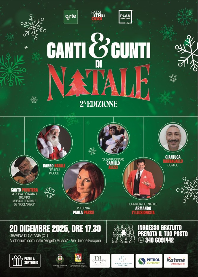 Il Sindaco Massimiliano Giammusso, il vicesindaco con delega alla Cultura Claudio Nicolosi e l'assessore allo Spettacolo Filippo Riela comunicano infatti alla Cittadinanza, a nome di tutta l'Amministrazione comunale gravinese, che sabato 20 dicembre alle 17:30 l’auditorium comunale "Angelo Musco" - ubicato in via Unione Europea nella stessa sede del Centro civico - si trasformerà in un vero scrigno natalizio, dove musica, racconti, magia e risate si uniranno per far vivere al pubblico la calda atmosfera delle festività natalizie.