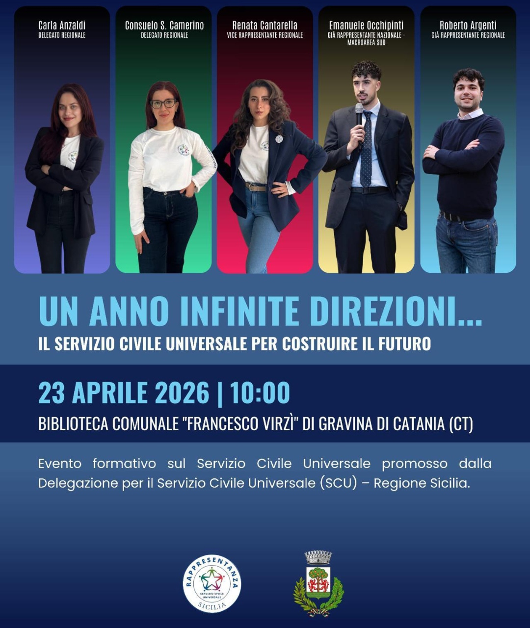Il sindaco Massimiliano Giammusso e l'assessore al Servizio civile Sebastiano Petralia comunicano alla Cittadinanza, a nome di tutta l'Amministrazione comunale gravinese, che giovedì 23 aprile alle ore 10:00 presso la biblioteca comunale "Francesco Virzì" sita in via Unione europea (sede del Centro civico) avrà luogo un evento formativo dal titolo "Un anno, infinite direzioni" dedicato al Servizio civile universale.