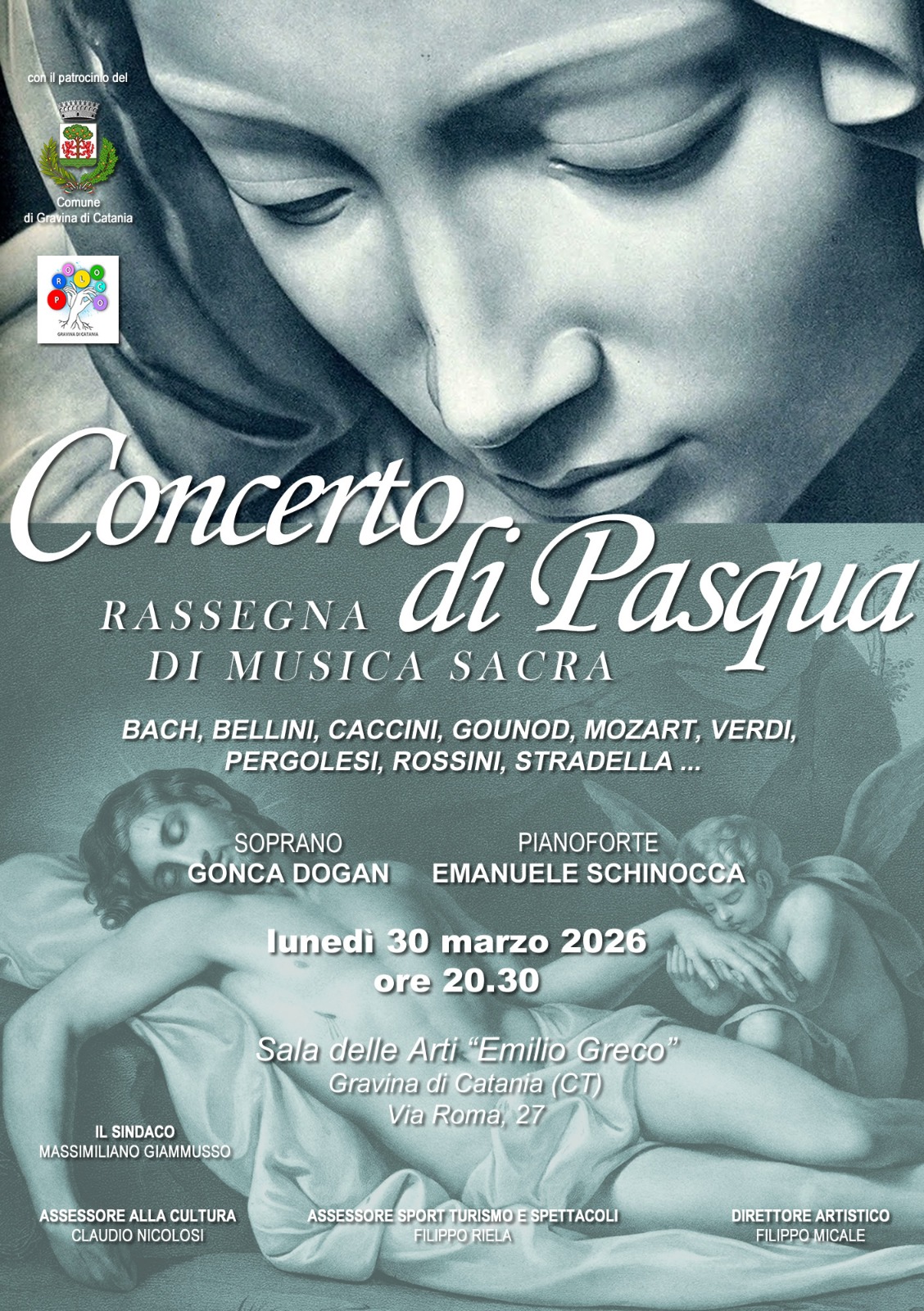 Il sindaco Massimiliano Giammusso, il vicesindaco con delega alla Cultura Claudio Nicolosi e l'assessore allo Spettacolo Filippo Riela comunicano alla Cittadinanza, a nome di tutta l'Amministrazione comunale gravinese, che lunedì 30 marzo alle ore 20:30 presso la Sala delle Arti "Emilio Greco", situata all'interno del parco comunale "Paolo Borsellino" di via Roma 27 (ingresso anche da via Costarelli e via Francesco Crispi), avrà luogo il tradizionale Concerto pasquale di musica sacra.