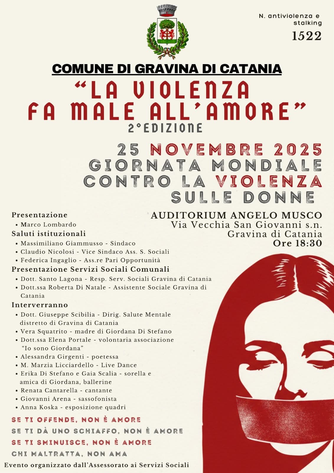Il Sindaco Massimiliano Giammusso, il vicesindaco con delega alla Cultura ed ai Servizi sociali Claudio Nicolosi e l'assessore alle Pari opportunità Federica Ingaglio comunicano alla Cittadinanza, a nome di tutta l'Amministrazione comunale gravinese, che martedì 25 novembre alle ore 18:30 presso l'auditorium "Angelo Musco" (stessa struttura del Centro civico) di Via Vecchia San Giovanni avrà luogo l'evento, organizzato dall'Assessorato ai Servizi sociali, "La violenza fa male all'amore" che si svolgerà in occasione della "Giornata mondiale contro la violenza sulle donne".