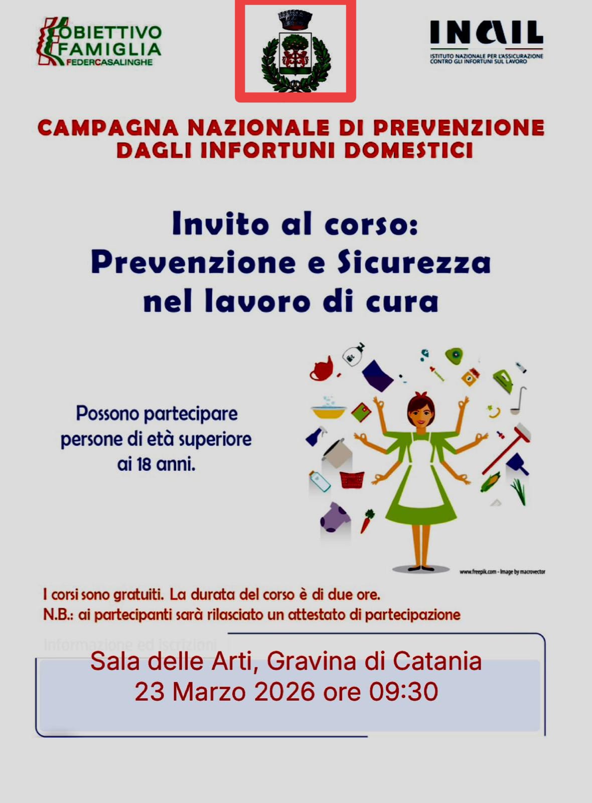 L'evento, realizzato dietro iniziativa dell'associazione "Obiettivo Famiglia - Federcasalinghe" e dell'INAIL, gratuito e patrocinato dal Comune di Gravina di Catania, rientra fra quelli afferenti alla Campagna nazionale di prevenzione degli infortuni domestici ed è rivolto ai cittadini maggiorenni cui sarà rilasciato un attestato di partecipazione a conclusione dello stesso.