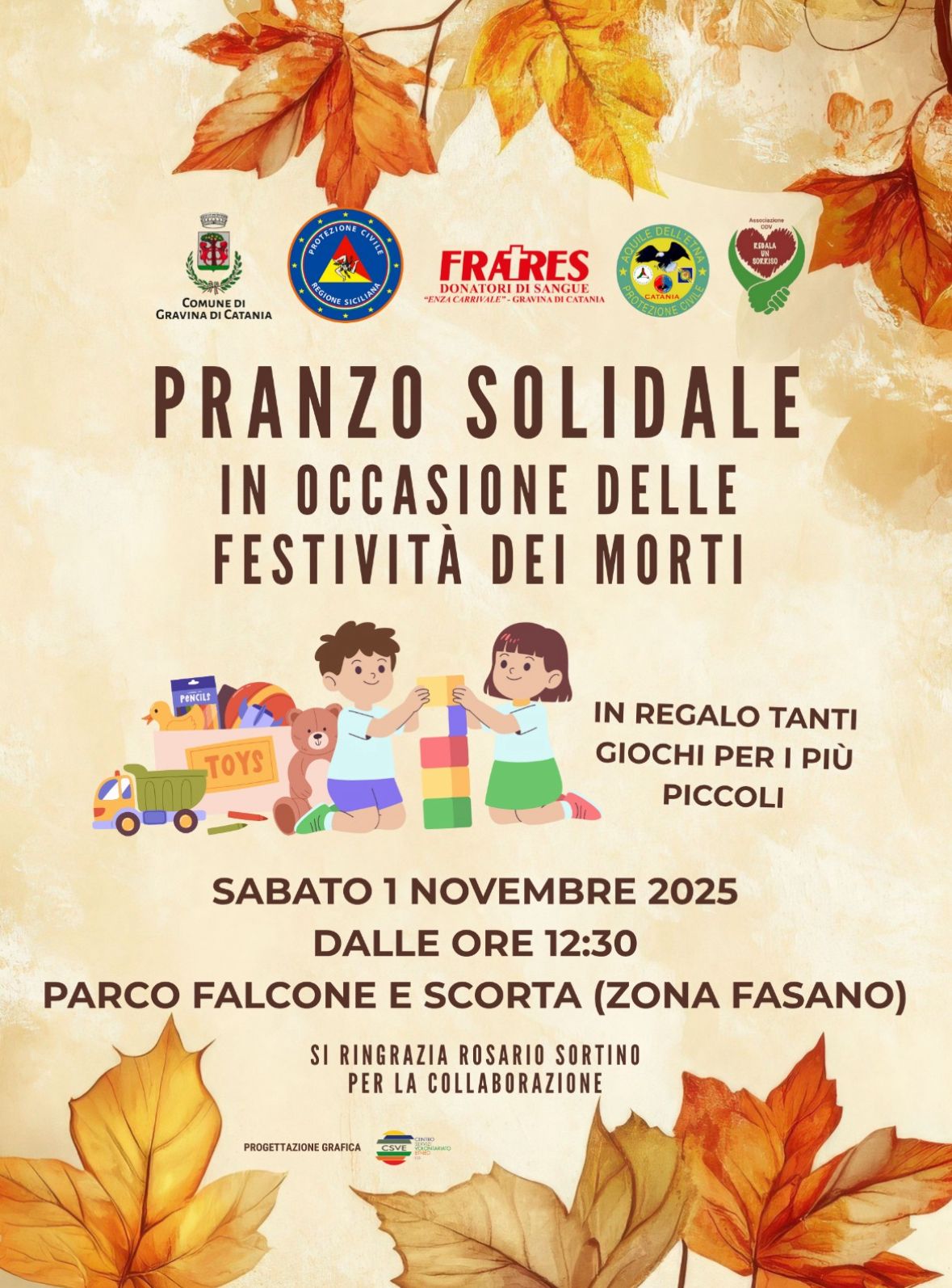 Il Sindaco Massimiliano Giammusso ed il vicesindaco con delega ai Servizi sociali Claudio Nicolosi comunicano alla Cittadinanza, a nome di tutta l'Amministrazione comunale, che sabato 1° novembre, in concomitanza con la imminente Commemorazione dei defunti, alle ore 12:30 presso il Parco comunale "Giovanni Falcone e scorta" di Fasano avrà luogo un pranzo solidale destinato alle famiglie meno fortunate del territorio.