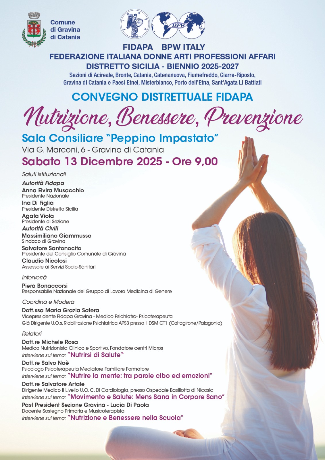 Il Sindaco Massimiliano Giammusso ed il vicesindaco con delega ai Servizi socio-sanitari Claudio Nicolosi informano la Cittadinanza in merito al convegno distrettuale Fidapa sulla tematica "Nutrizione, benessere, prevenzione" che avrà luogo sabato 13 alle ore 9:00 presso la sala consiliare "Peppino Impastato" del comune di Gravina di Catania sito in via Guglielmo Marconi 6.