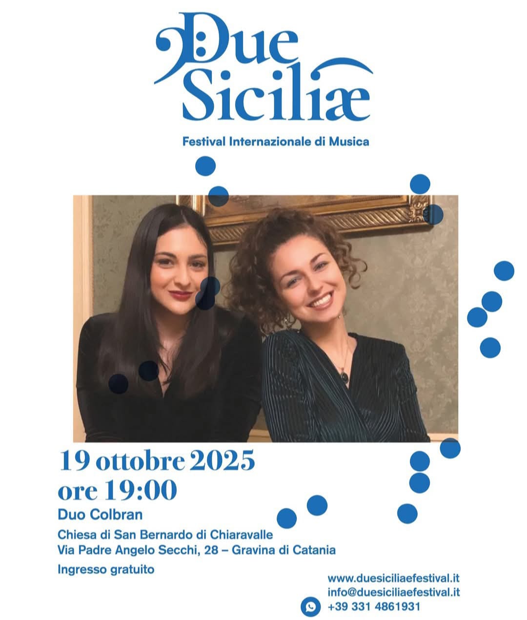 Il sindaco Massimiliano Giammusso, il vicesindaco con delega alla Cultura Claudio Nicolosi e l'assessore allo Spettacolo Filippo Riela comunicano alla Cittadinanza che sabato 18 e domenica 19 ottobre prossimi, rispettivamente all'Auditorium "Angelo Musco" alle 21:00 e nella Chiesa di San Bernardo a Fasano alle ore 19:00, sono previsti due nuovi appuntamenti con il Festival musicale internazionale "Due Siciliae".