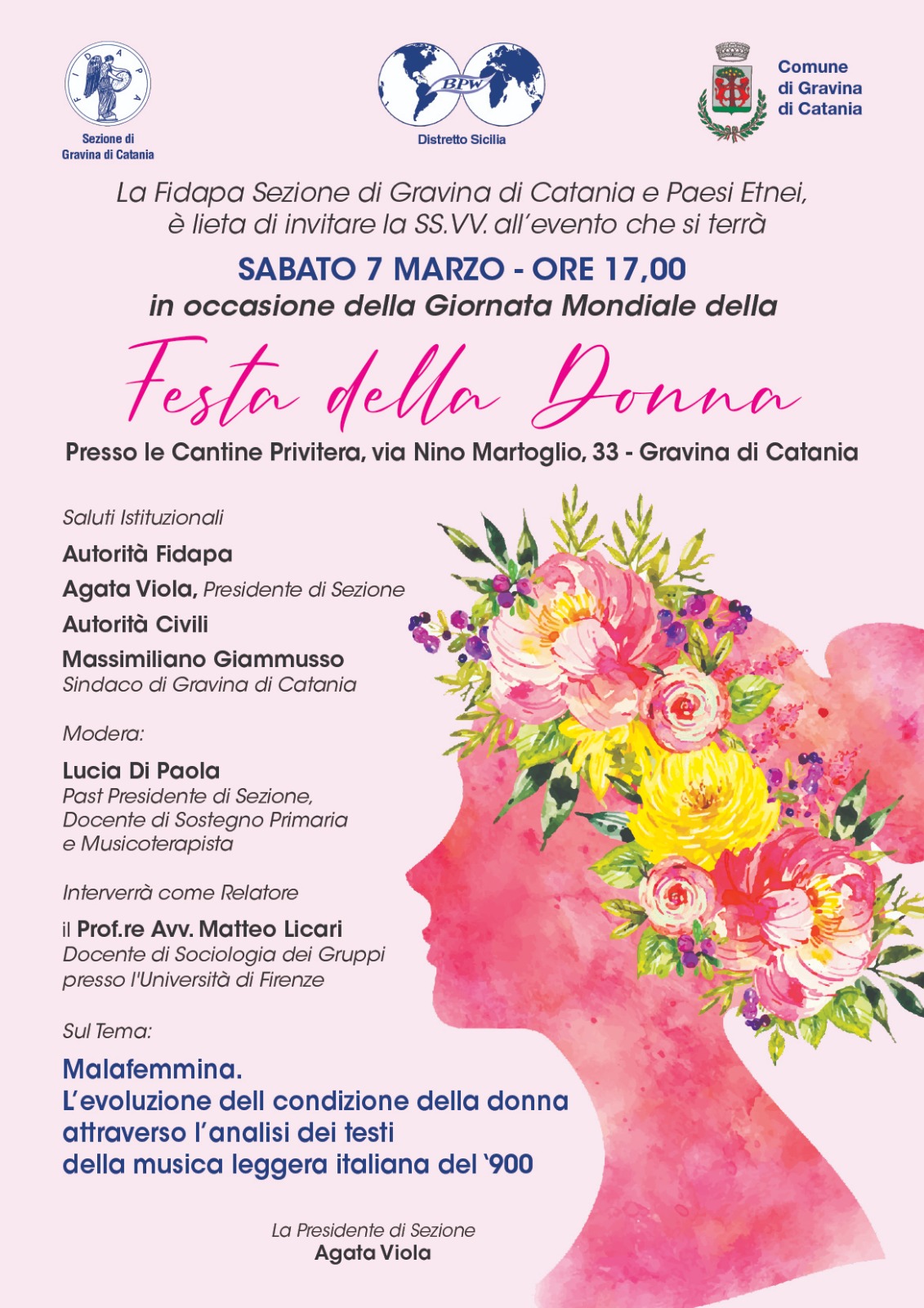 L'iniziativa, ideata dalla locale sezione della "Fidapa", che ha in Agata Viola la sua presidente, e realizzata grazie al patrocinio del Comune di Gravina di Catania, dopo l'iniziale momento dei saluti istituzionali, vedrà l'intervento della moderatrice, la past president e docente Lucia Di Paola, e del relatore prof. avv. Matteo Licari che tratterà l'evoluzione della condizione della donna a partire dall'analisi dei testi della musica leggera italiana del Novecento.