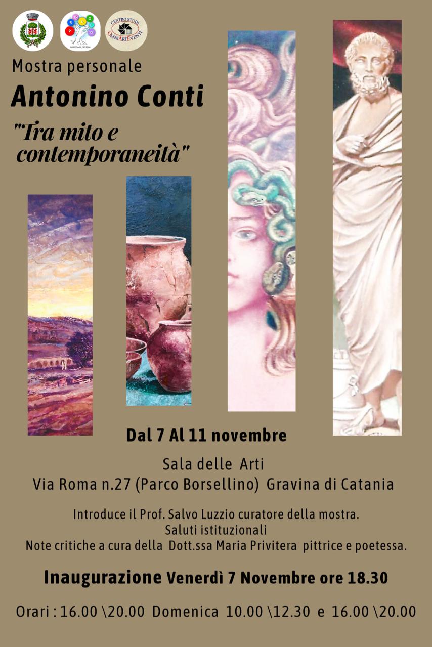 Il Sindaco Massimiliano Giammusso ed il vicesindaco con delega alla Cultura Claudio Nicolosi comunicano alla Cittadinanza, a nome di tutta l'Amministrazione comunale gravinese, che da venerdì 7 novembre a martedì 11 novembre presso la Sala delle Arti "Emilio Greco", situata all'interno del parco "Paolo Borsellino" di via Roma 27 (ingresso anche da via Costarelli e via Francesco Crispi), avrà luogo la mostra di pittura personale dell'artista Antonino Conti "Tra mito e contemporaneità".